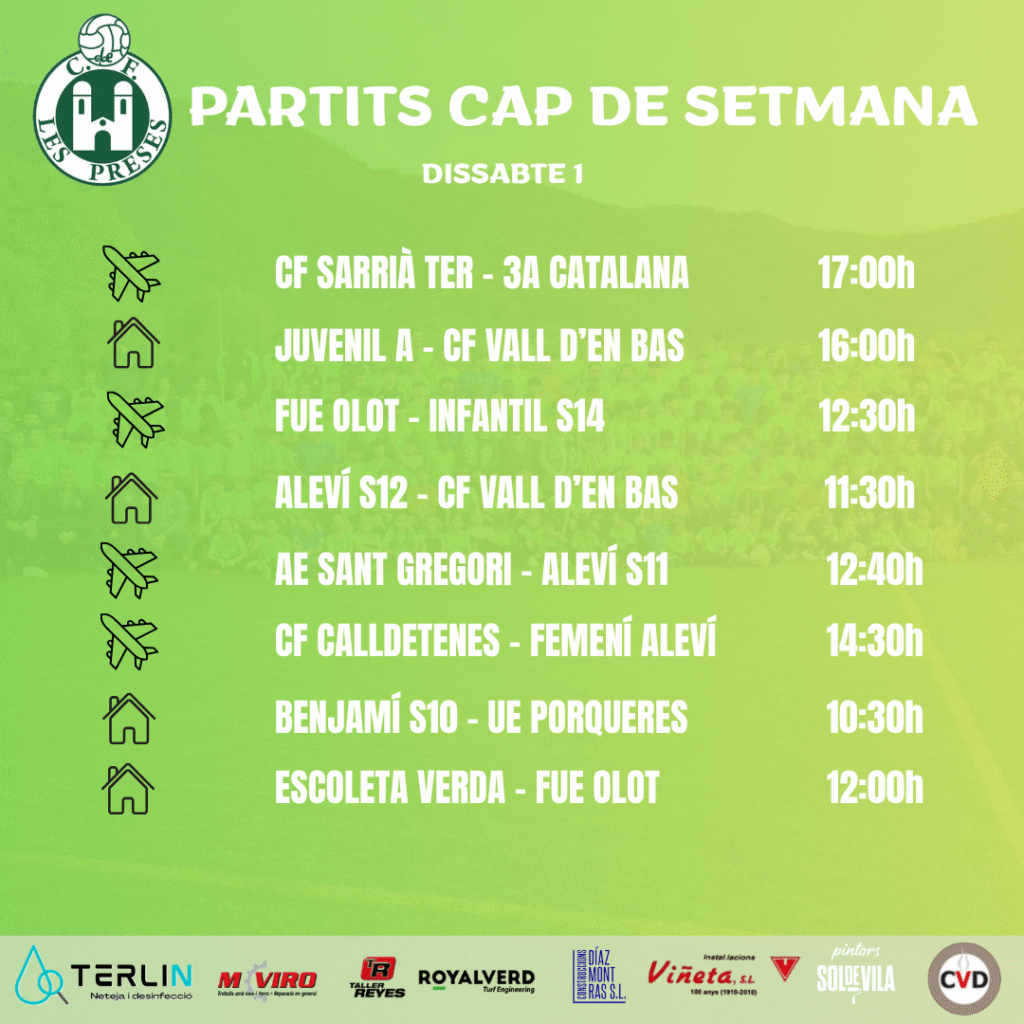Dissabte de la majoria de partits dels nostres equips de futbol base. Els més matiners són el Benjamí S10 a casa contra el Porqueres i l’Aleví S12 a les 11:30 contra la Vall d’en Bas. A les dotze, torn per l’Escoleta Verda que rep l’Olot. A les 12:30 l’Infantil S14 visita el camp de la FUE Olot i deu minuts després l’Aleví S11 jugarà a Sant Gregori. A les 14:30 el Femení Benjamí Aleví jugarà a Calldetenes. A la tarda, a les quatre el Juvenil ‘A’ rep a la Vall d’en Bas i el primer equip visita el complicat camp del Sarrià a les cinc de la tarda.