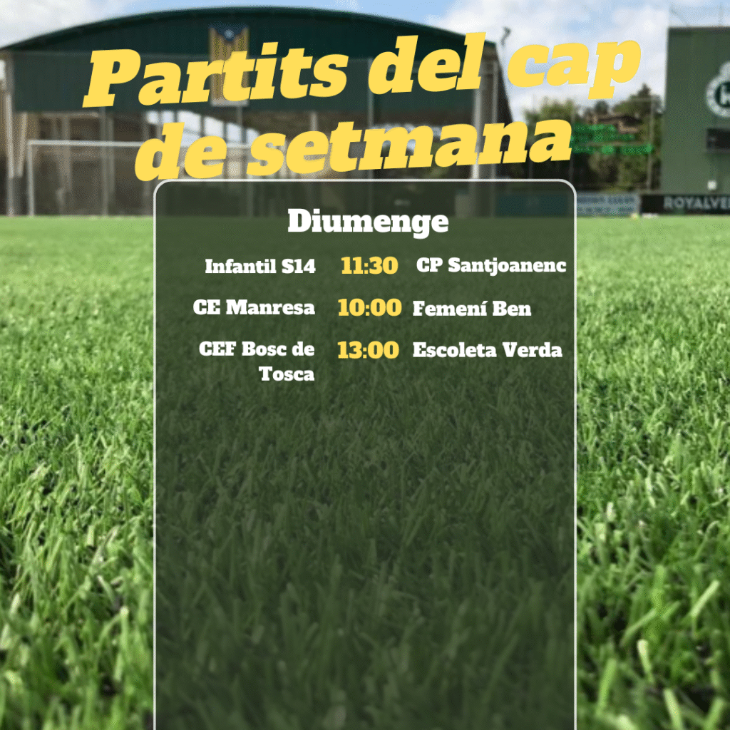 Diumenge de tres partits dels nostres equips. Infantil S14 rep al Santjoanenc i el Femení Benjamí i l’Escoleta Verda visiten Manresa i Bosc de Tosca respectivament.