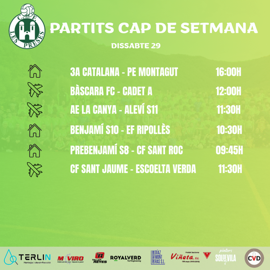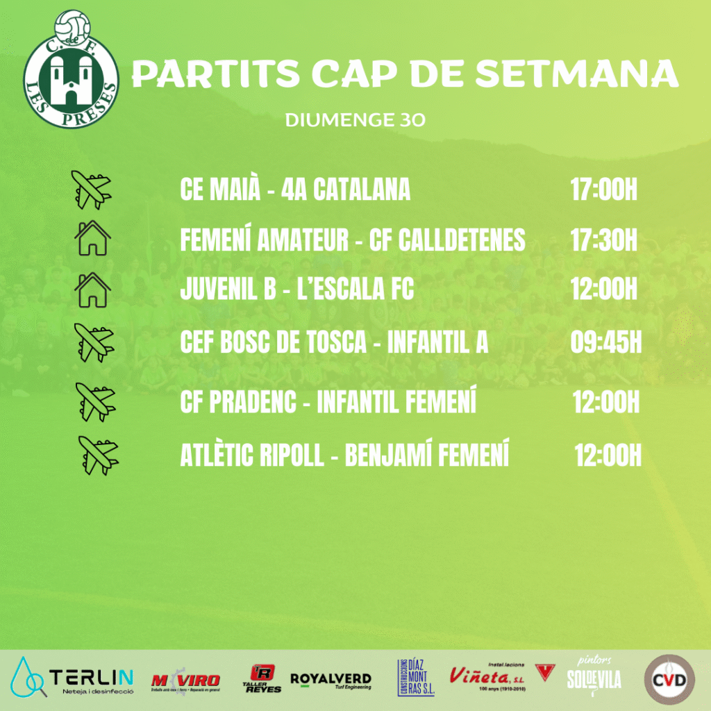 Diumenge també tindrem sis partits més: al matí el Juvenil ‘B’ rebrà a l’Escala. Tots els altres enfrontaments jugarem com a visitants. El Benjamí Femení jugarà al camp de l’Atlètic Ripoll, l’Infantil Femení ho farà a Pradenc i l’Infantil A jugarà el derbi a Bosc de Tosca. A la tarda, torn pels sèniors: el Femení Amateur rebrà al Calldetenes a dos quarts de sis de la tarda i el filial visitarà el complicat camp del Maià a les cinc.
