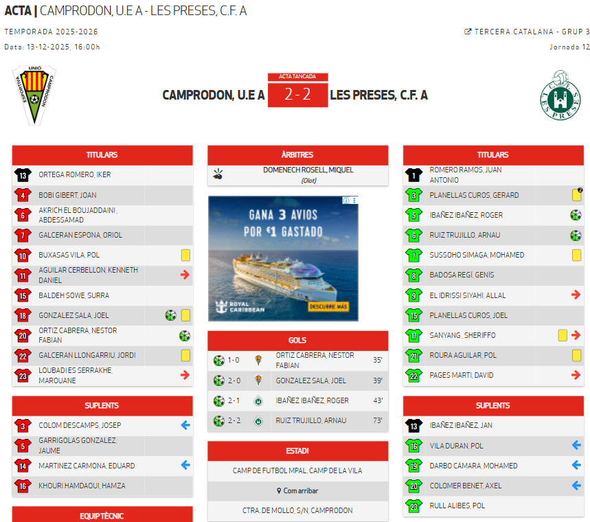El primer equip va empatar aquest dissabte al camp de la UE Camprodon, segon classificat. Després de fer un gran partit, els de Pau Clavaguera van aconseguir fer un gran partit a tots nivells per posar contra les cordes un dels millors equips de la categoria. Després de començar perdent per 2 gols a 0 amb dues accions dels locals, vam aconseguir retallar distàncies abans de marxar al descans amb un golàs del defensa Roger Ibañez. A la represa, vam seguir insistint i vam acabar empatant el partit amb un gol des del mig del camp d’Arnau Ruiz. El partit va acabar amb un Camprodon apretant i va gaudir d’alguna ocasió al final per acabar aconseguit els tres punts. Finalment, en l’última jugada del partit, el nostre defensa, Gerard Planellas va veure la segona groga i es perdrà el pròxim partit. Ara, les Preses no jugarà fins al 2026.