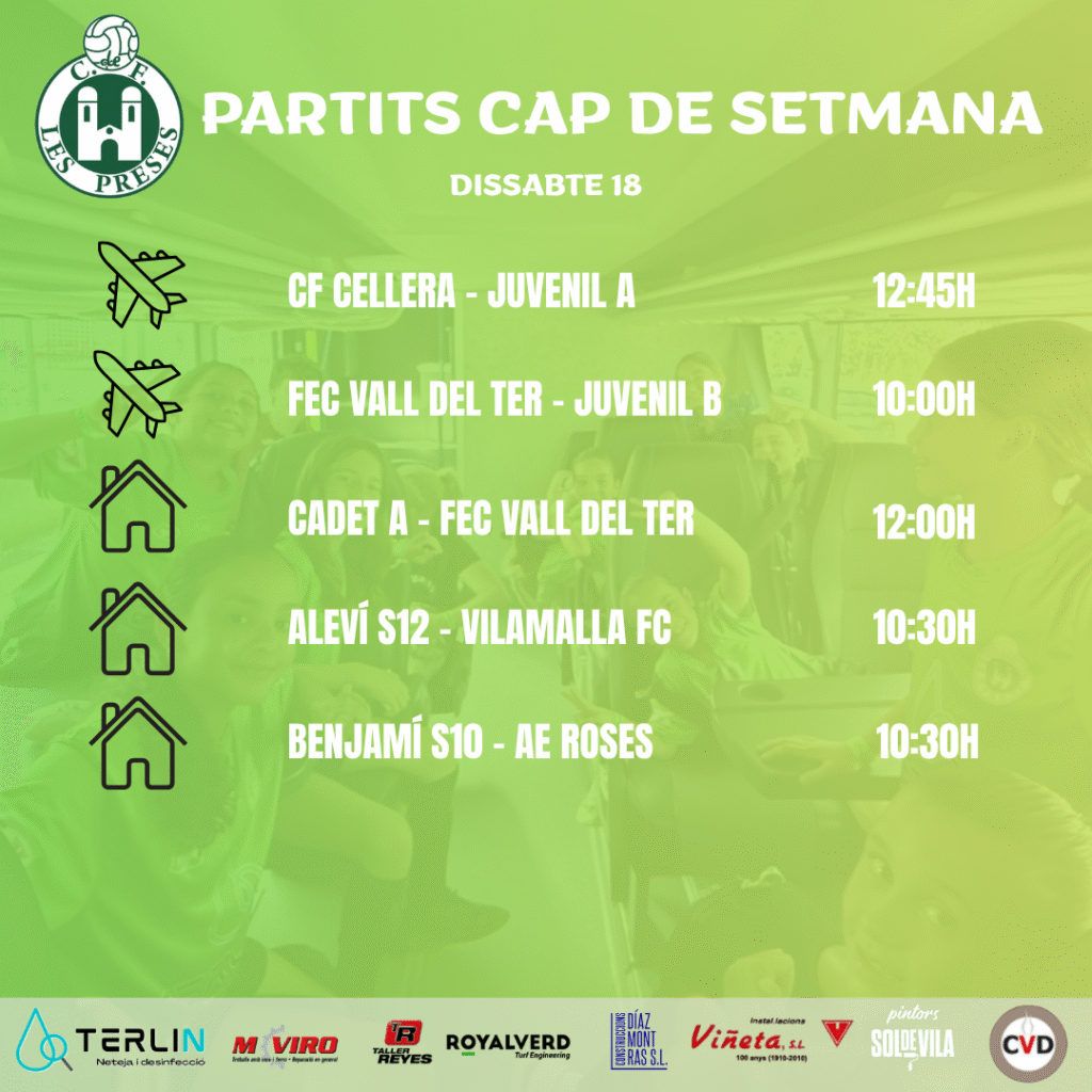 Ja tenim els partits del cap de setmana! El Juvenil ‘A’ vol seguir amb la bona dinàmica al camp de la Cellera. El Juvenil ‘B’ i el Cadet ‘A’ juguen contra la FEC Vall del Ter. L’Aleví S12 rebrà a Vilamalla a dos quarts d’onze i el Benjamí S10 rebrà a l’AE Roses!