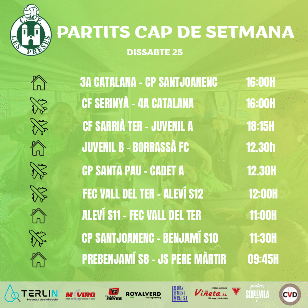 Aquest dissabte comencem amb el Prebenjamí S8 que rep al Sant Pere Màrtir. Partits com a visitant: el Benjamí S10 que visita el camp del Santjoanenc, l’Aleví S12 que juga al camp de la FEC Vall del Ter, el Cadet A que juga al camp del Santa Pau i el Juvenil ‘A’ i el filial que visiten els camps del Sarrià de Ter i el Serinyà respectivament. Com a local, l’Aleví S11 que rep a la FEC Vall del Ter, el Juvenil B que rep al Borrassà i el primer equip que rep al Santjoanenc aquest dissabte a les quatre de la tarda.