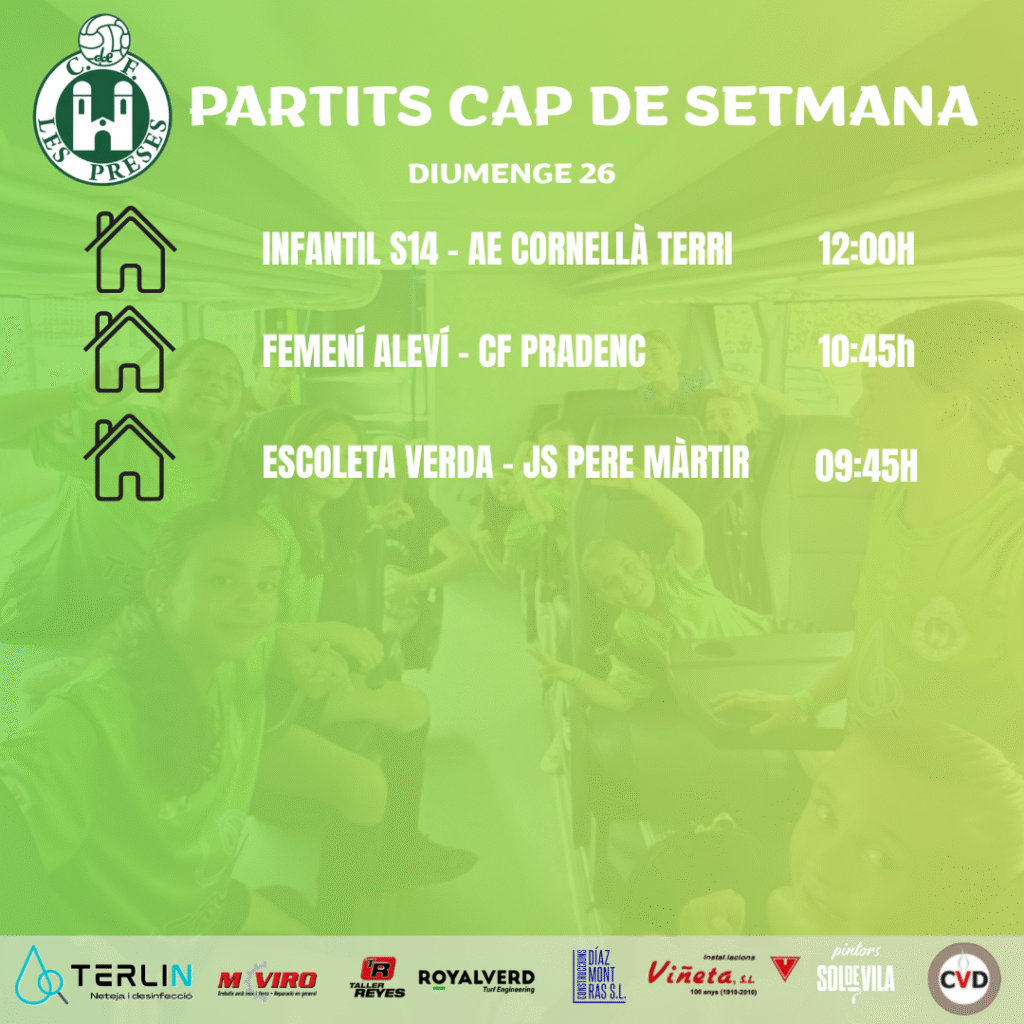 Diumenge només hi ha tres partits i tots tres com a locals. A primera hora del matí l’Escoleta Verda rep al Sant Pere Mârtir, el Femení Aleví que rep al Pradenc i l’Infantil que rep al Cornellà de Terri.