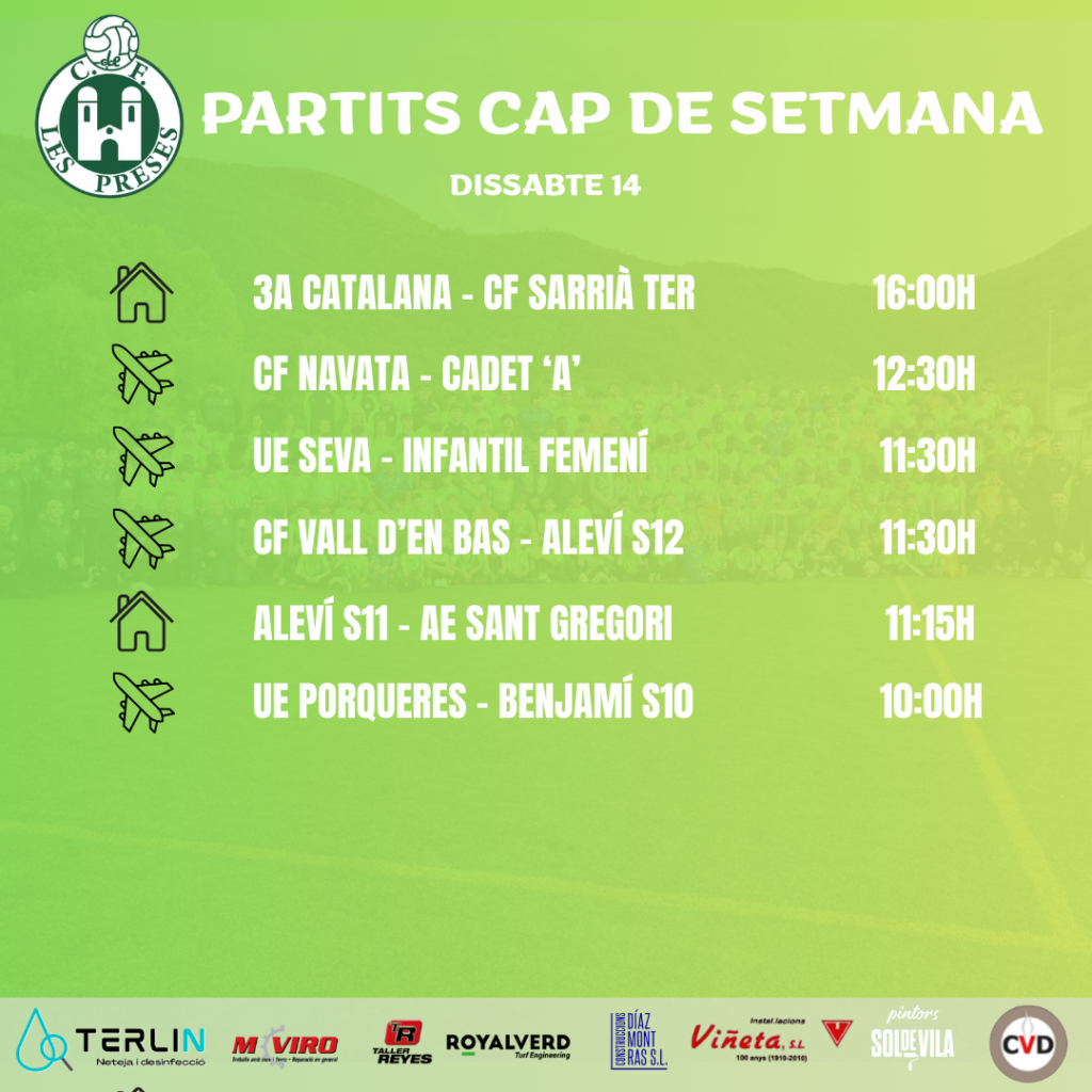 Aquest cap de setmana tornem a la competició. A primera hora, el Benjamí S10 visita el Porqueres. A un quart de dotze, l’Aleví S11 rebrà al Sant Gregori i un quart d’hora més tard serà el torn de l’Aleví S12 a la Vall d’en Bas i de l’Infantil Femení al camp del Seva. A dos quarts d’una, el Cadet ‘A’ visita el camp del Navata i a la tarda, el Tercera Catalana rebrà al Sarrià de Ter, rival de la part alta de la classificació.