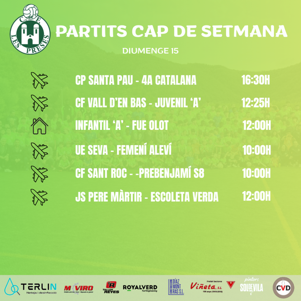Diumenge a primera hora, el Prebenjamí S8 visitarà al Sant Roc i el Femení Aleví jugarà a Seva. A les dotze: dos partits, l’Escoleta Verda al camp del Sant Pere Màrtir i l’Infantil ‘A’ que rebrà a l’Olot en un partit clau per les aspiracions a playoff. Una estoneta més tard el Juvenil ‘A’ vol guanyar al camp de la Vall d’en Bas i seguir a la part més alta de la taula i a la tarda, el filial vol assaltar el camp del Santa Pau en un partit entre dos equips que fa mesos que no perden.