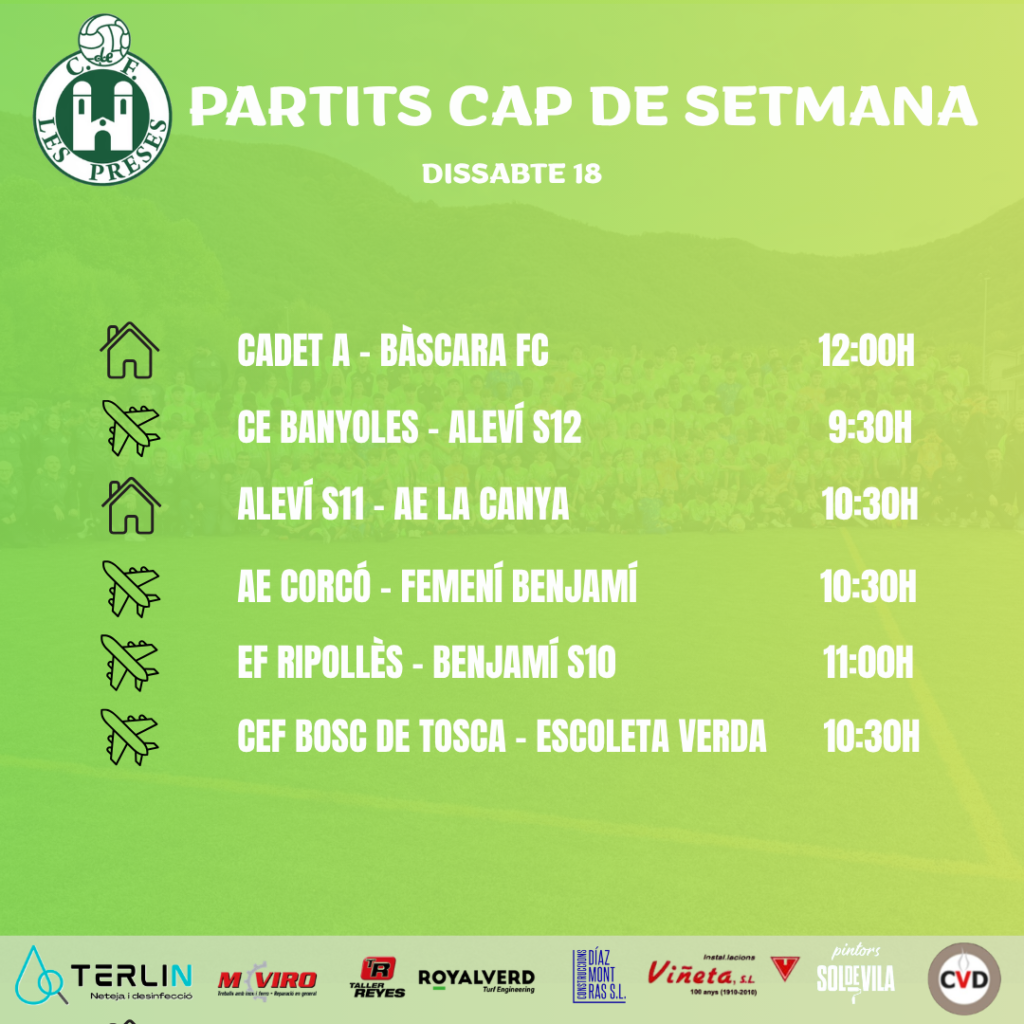 Dissabte tenim molts partits. A dos quarts de deu del matí, l’Aleví S12 visita el camp del Banyoles. A dos quarts d’onze, tres partits: l’Aleví S11 rep a la Canya i el Femení Benjamí i l’Escoleta visiten el camp del Corcó i el del Bosc de Tosca respectivament. A les onze del matí, el Benjamí S10 visita el camp del Ripollès i a les dotze del migdia, el Cadet ‘A’ juga a casa contra el Bàscara.