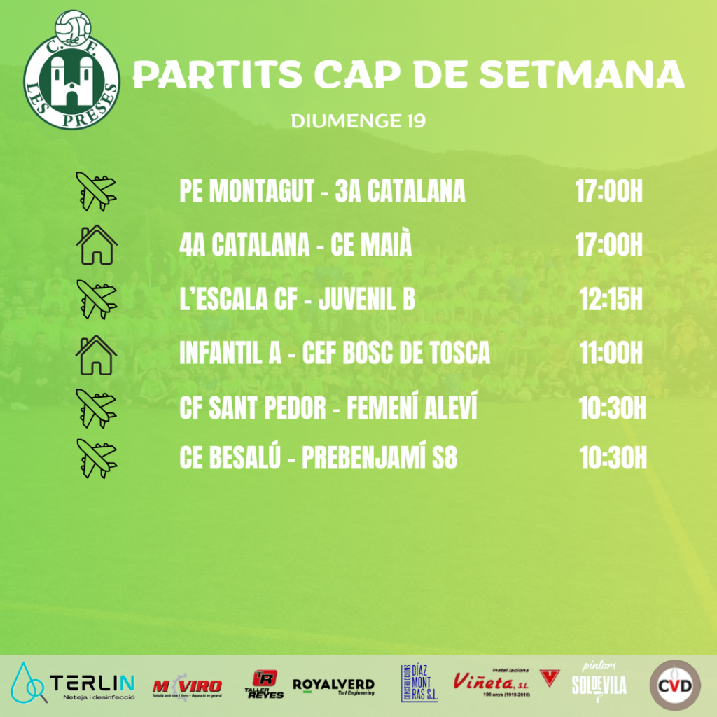 Per tancar el cap de setmana també tenim més partits. A dos quarts d’onze del matí, el Prebenjamí S8 visita el camp del Besalú i el Femení Aleví es desplaça fins al camp del Sant Pedor. A les onze, derbi entre l’Infantil A i el Bosc de Tosca. A un quart d’una del migdia, el Juvenil B juga al camp de l’Escala. A la tarda, dos partits dels nostres sèniors. A les cinc, el primer equip visitarà el camp del Montagut i el filial rebrà al Maià per tancar al cap de setmana al Municipal.