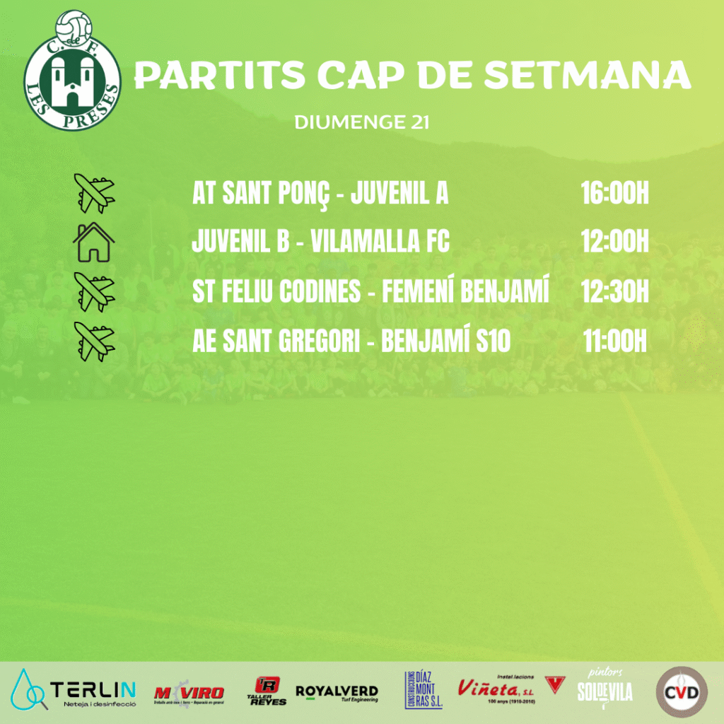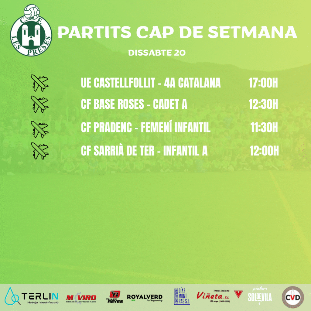 Aquest dissabte arriba l’última jornada del 2025. Els quatre partits del futbol base del club seran com a visitants. Al matí, el Femení Infantil jugarà al camp del Pradenc. A les dotze l’Infantil A visitarà Sarrià de Ter i mitja hora més tard el Cadet A jugarà al camp del Base Roses. A la tarda, el filial intentarà aconseguir la victòria al camp del líder, el Castellfollit.