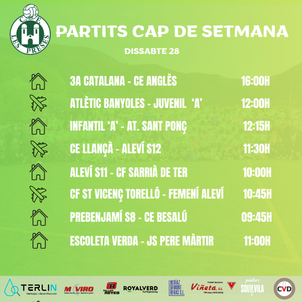 Dissabte tenim la gran quantitat de partits. A tres quarts de deu del matí el Prebenjamí S8 rep al Besalú. A les deu, l’Aleví S11 rep al Sarrià de Ter. Tres quarts d’hora més tard el Femení Aleví Benjamí visita el camp del Sant Vicenç de Torelló. A les onze serà el torn de l’Escoleta Verda que rep al Joventut Sant Pere Màrtir. A dos quarts de dotze l’Aleví S12 juga al camp del Llança. A les dotze: el Juvenil A jugarà al camp de l’Atlètic Banyoles i un quart d’hora més tard l’Infantil A rep a l’Atlètic Sant Ponç. A les quatre, el partit del primer equip contra l’Anglès en el partit de la jornada.