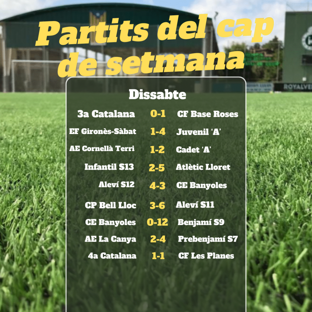 Victòries més que importants del Juvenil ‘A’ al camp del Gironès-Sàbat que l’apropa una miqueta més a la permanència. Victòria també important de l’Aleví S12 a Banyoles en la segona fase d’ascens de categoria. També ha guanyat el Cadet ‘A’ que segueix imbatible, l’Aleví S12 a Bell Lloc, victòries del Benjamí S9 (FOTO) i el Prebenjamí S7 a Banyoles i la Canya, respectivament. Derrota del Tercera Catalana a casa contra el Base Roses i empat del filial contra les Planes.
